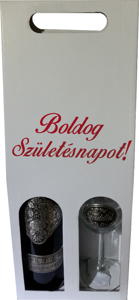 “Boldog Születésnapot” feliratú doboz fémcímkés borral és pohárral