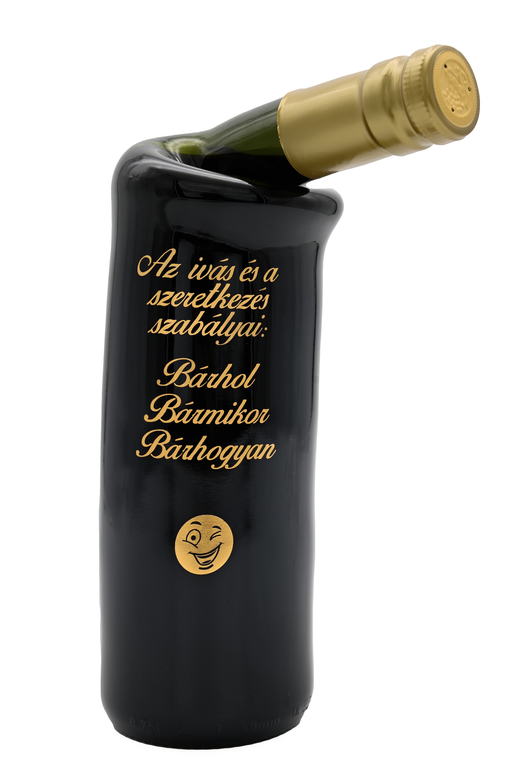 Cabernet Sauvignon ferdenyakú palack “Az ivás és a szeretkezés..” felirattal