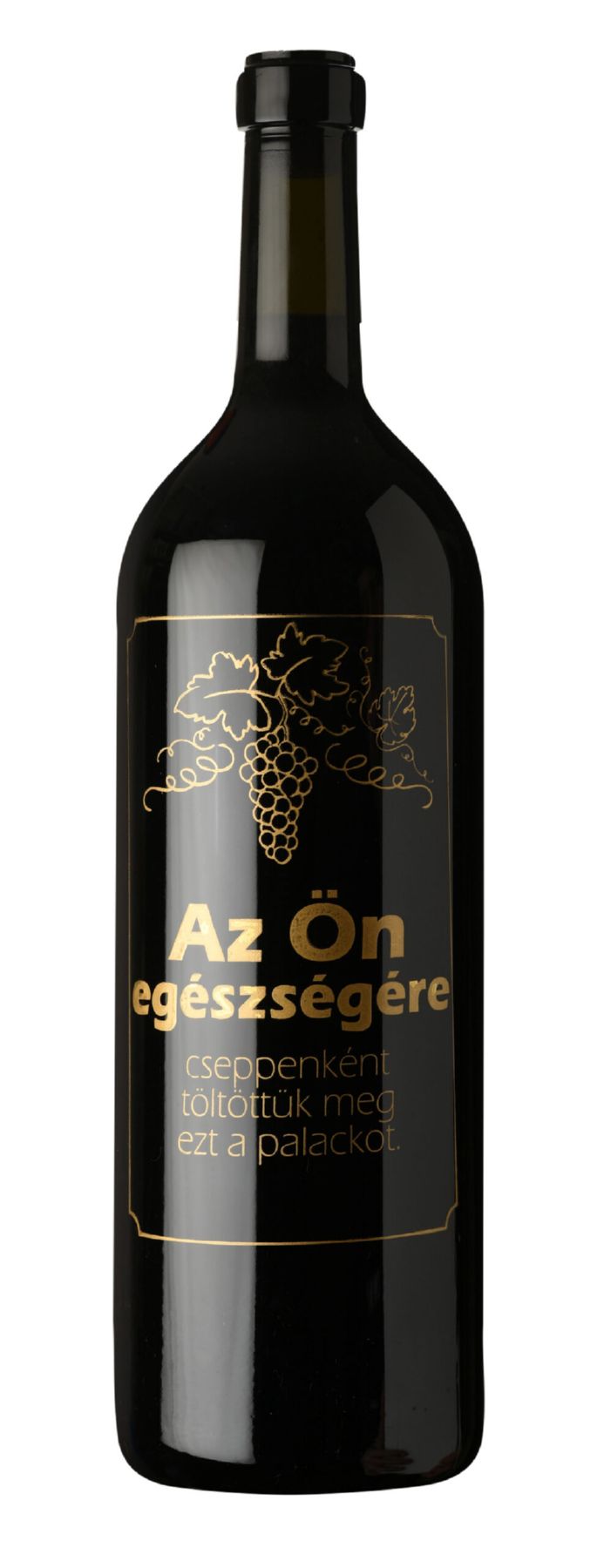 Egri Bikavér “az Ön egészségére palackozva” felirattal