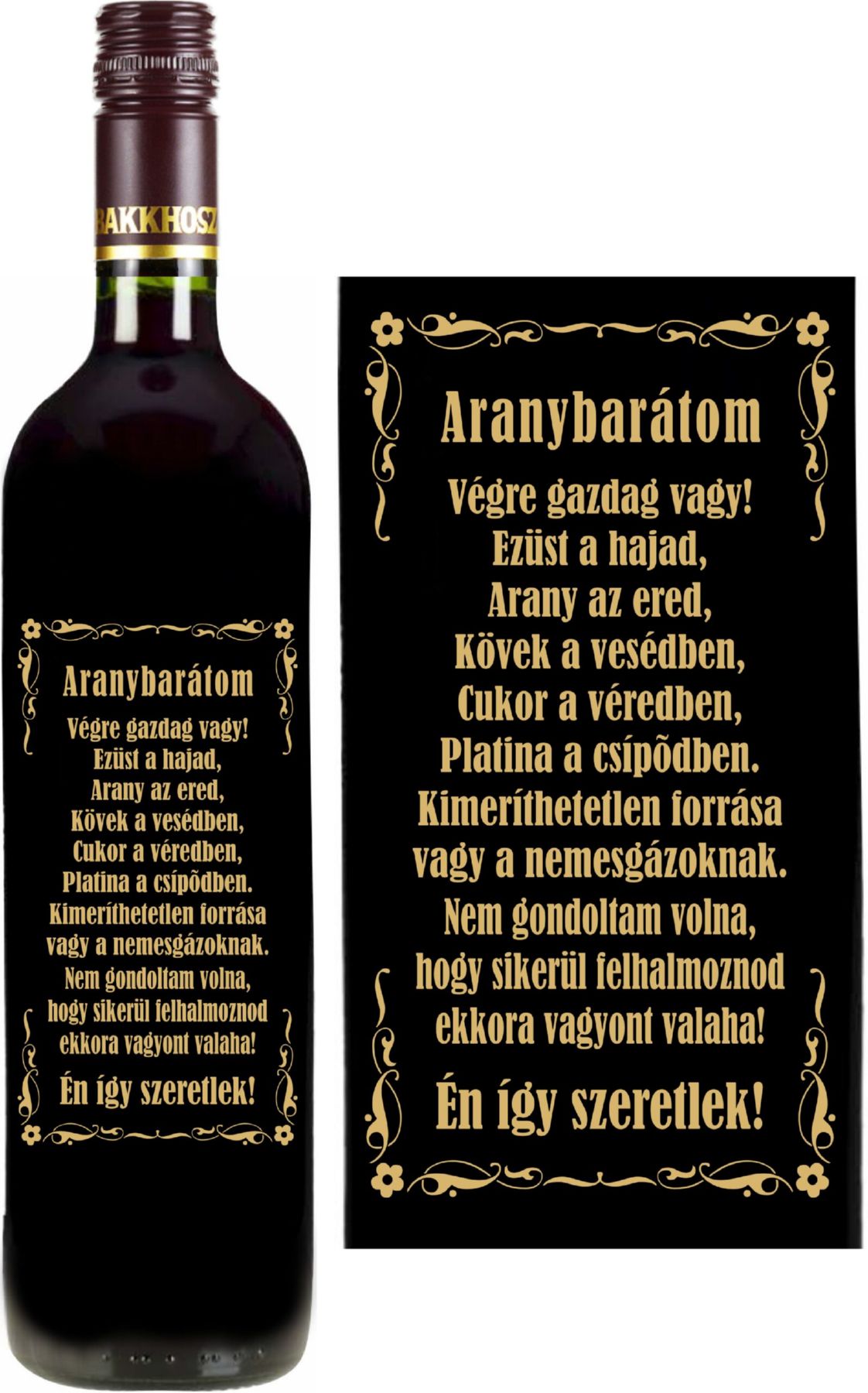 Mátrai Cabernet Sauvignon-nal töltött palack vicces “Aranybarátom” felirattal