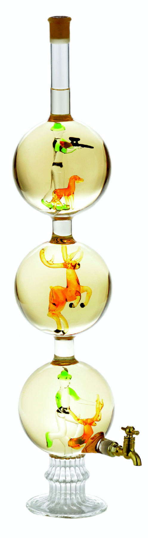 Exkluzív ajándékot keresel? Ebbe a 3 gömbös palackba egy vadászt rejtettünk szarvasvadászat jeleneteivel. A bortorony alján ízléses csap segít kitölteni a tartalmát. Exkluzív megjelenése miatt, erre ritkán kerül sor, noha Tokaji Furminttal töltöttük. E 3 gömbös csapos díszüveges bor kiváló ajándék vadász társunknak, barátunknak, kollégánknak bármilyen alkalomra.