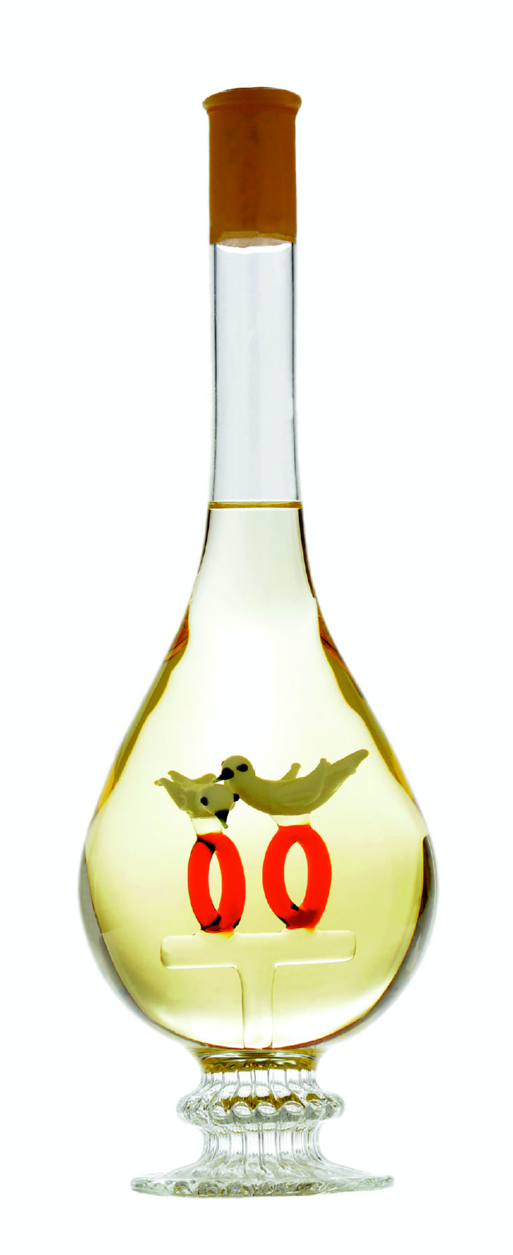 Nászajándékot az ifjú párnak? E lombik alakú díszüveges borunk – benne gyûrûkkel és galambokkal – kitûnõ nászajándék lehet! S hogy az ajándék még különlegesebb legyen, a palackot Tokaji Furmint száraz borral töltöttük.